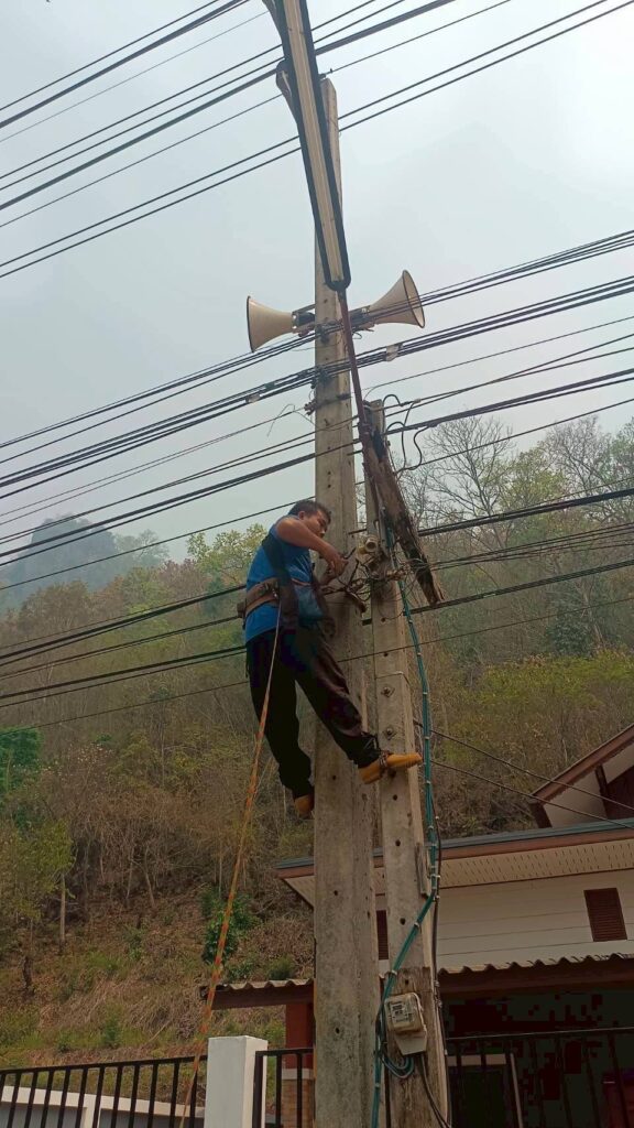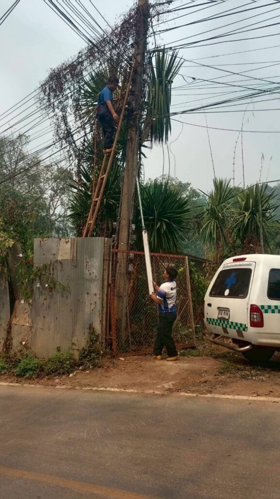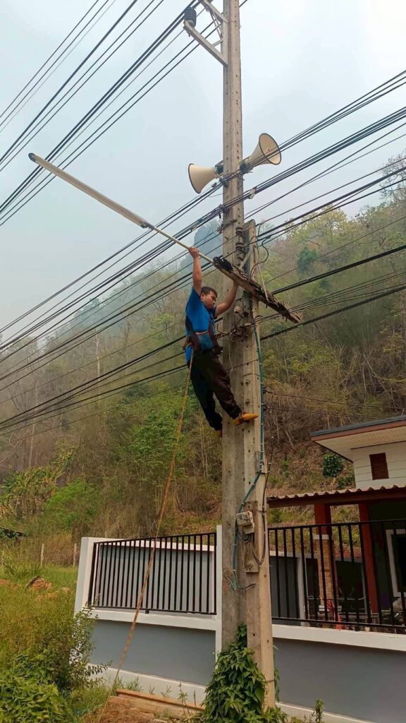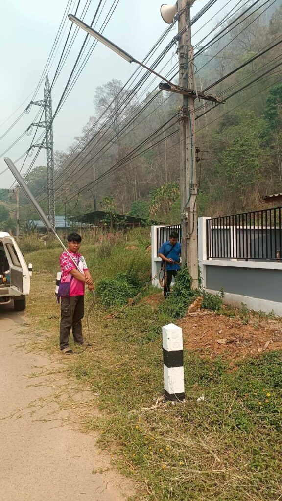 บุคลากรฝ่ายกองช่างซ่อมแซมเสาไฟให้แก่ชาวบ้าน