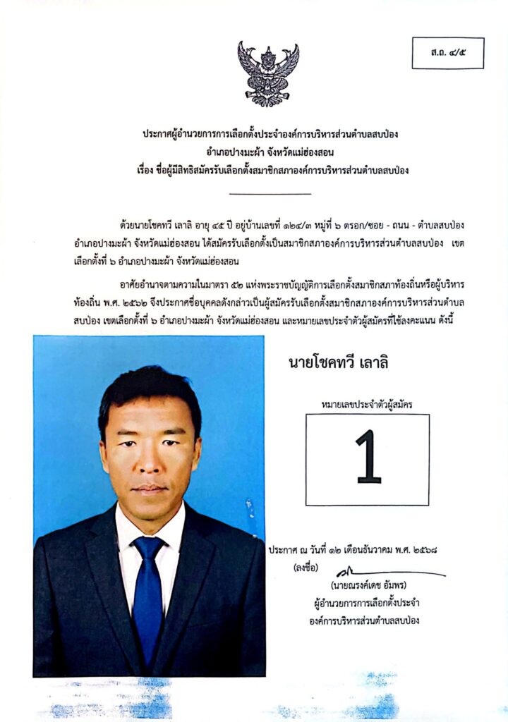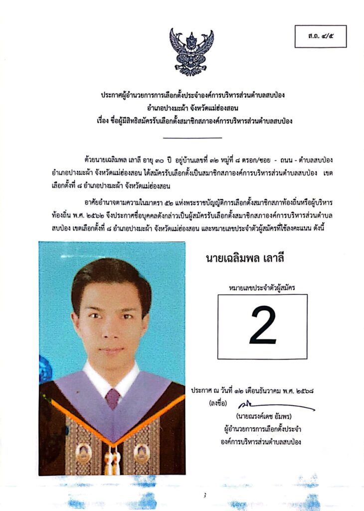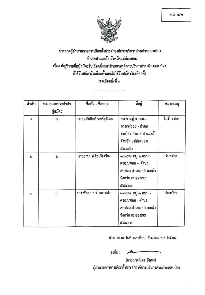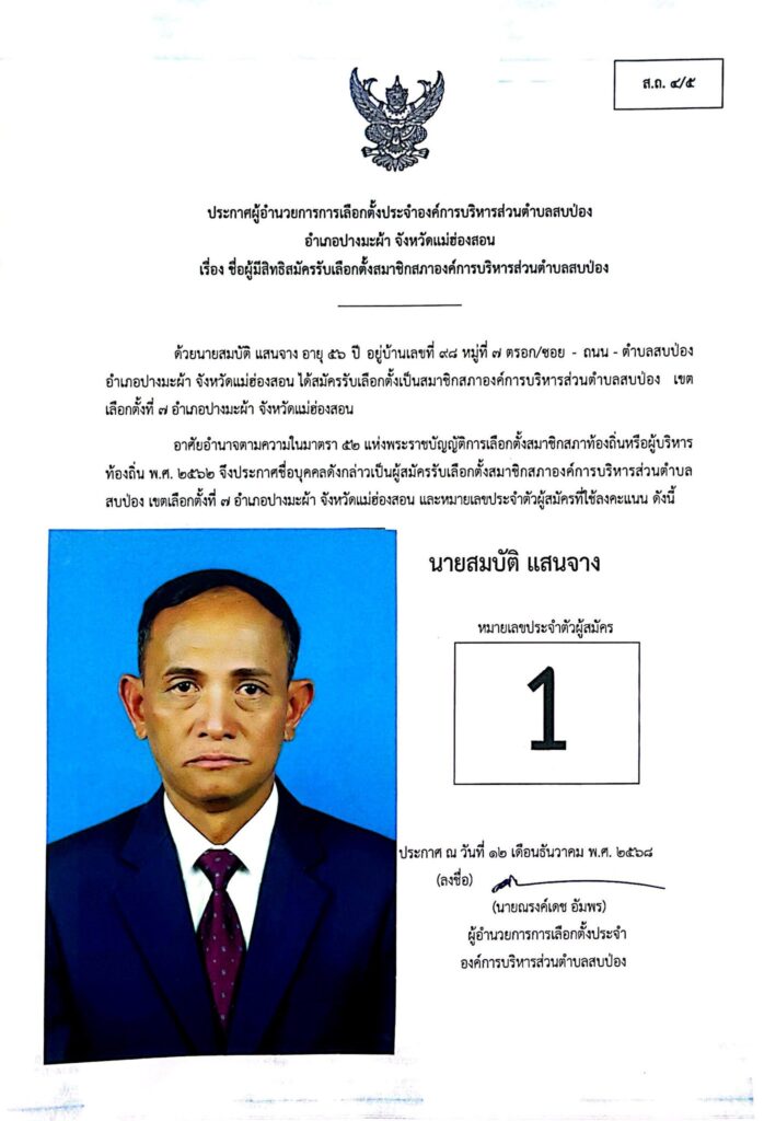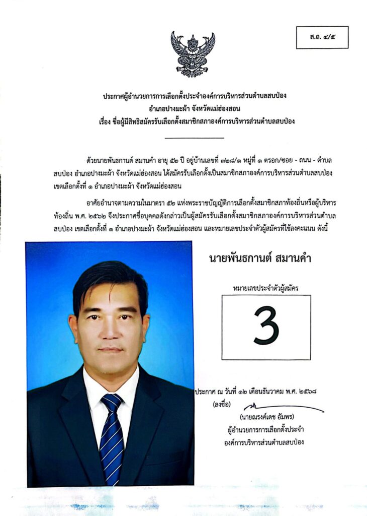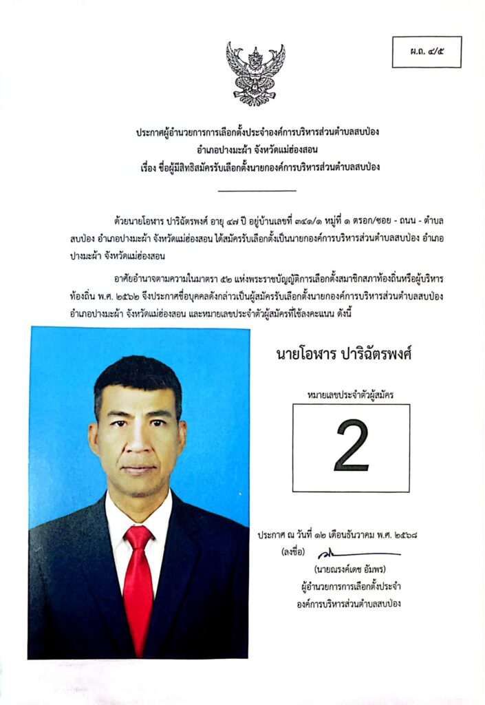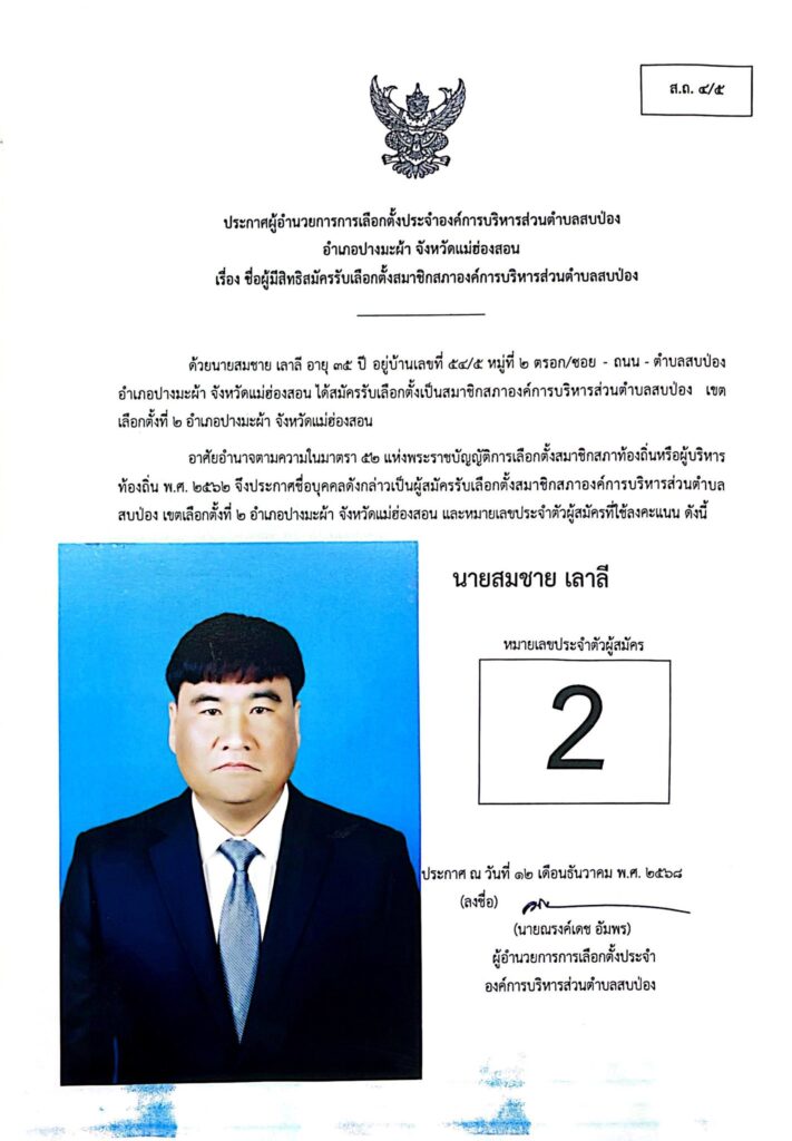 ประกาศผู้อำนวยการการเลือกตั้งประจำองค์การบริหารส่วนตำบลสบป่อง อำเภอปางมะผ้า จังหวัดแม่ฮ่องสอน ข่าวประชาสัมพันธ์, อบต.สบป่อง จำนวนผู้อ่าน : 313