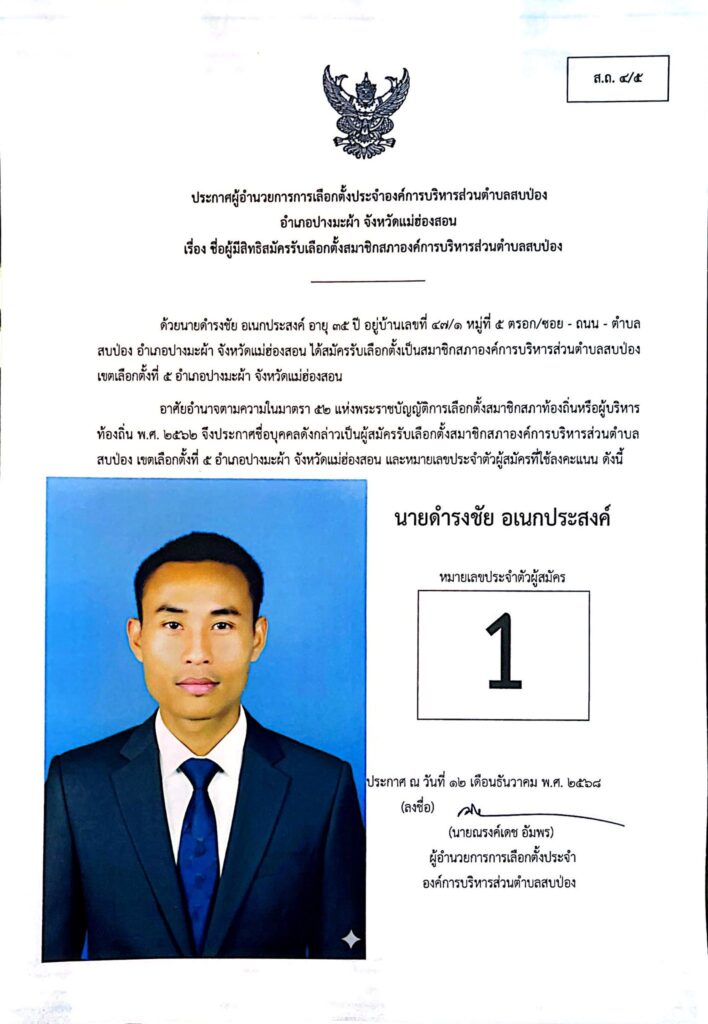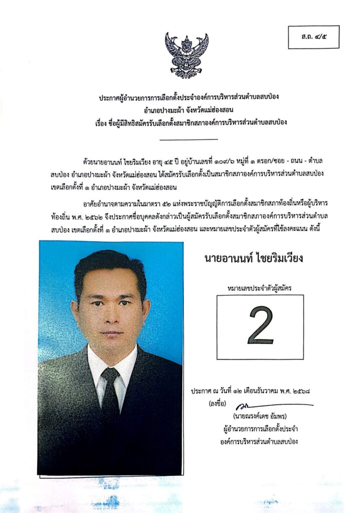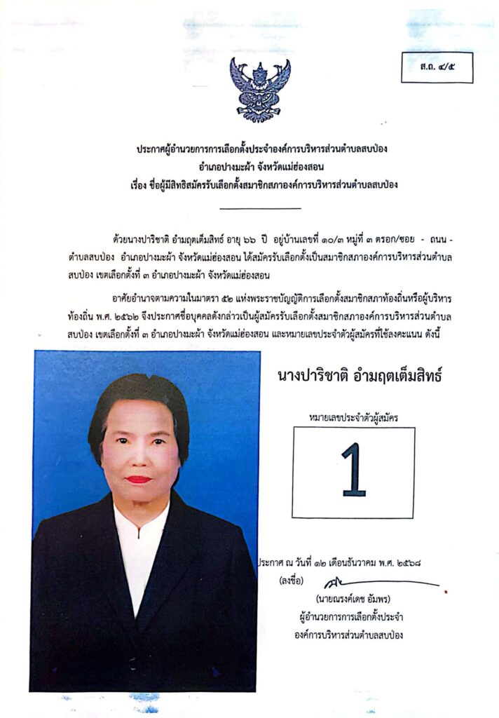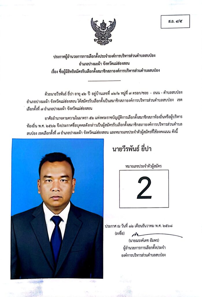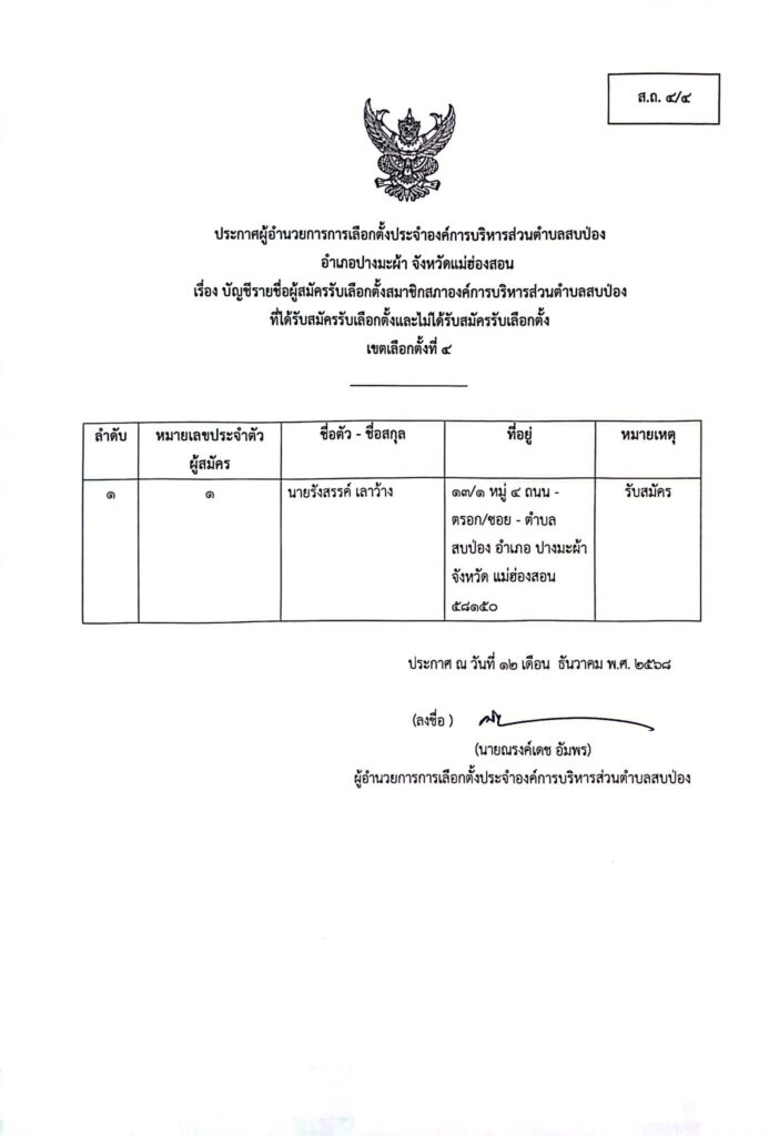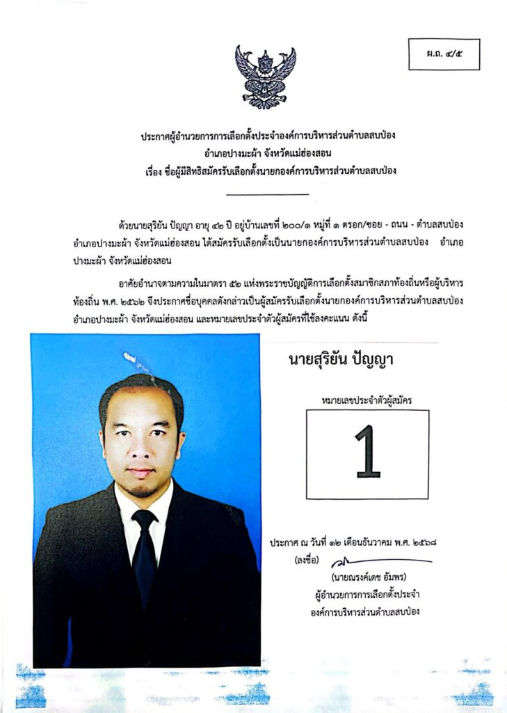 ประกาศผู้อำนวยการการเลือกตั้งประจำองค์การบริหารส่วนตำบลสบป่อง อำเภอปางมะผ้า จังหวัดแม่ฮ่องสอน ข่าวประชาสัมพันธ์, อบต.สบป่อง จำนวนผู้อ่าน : 313