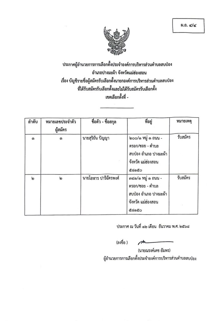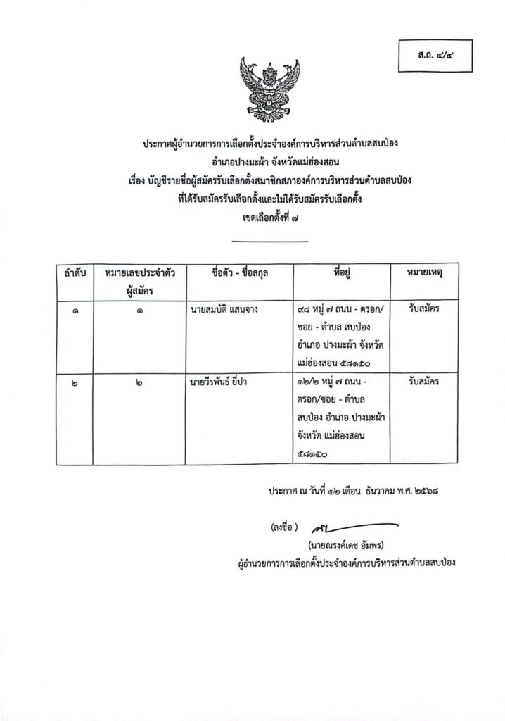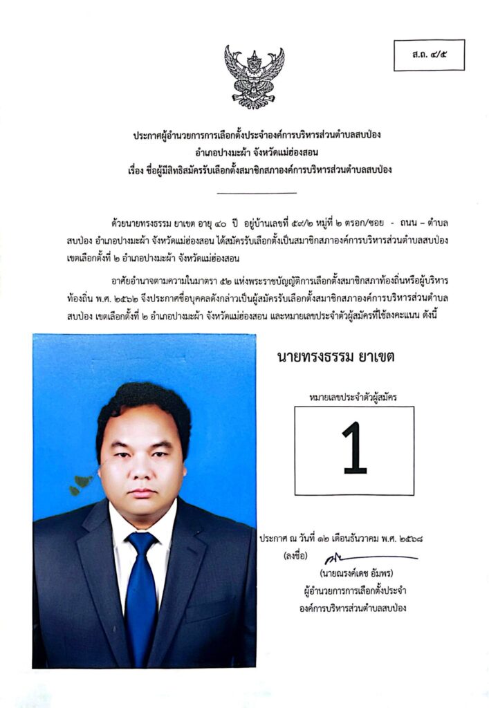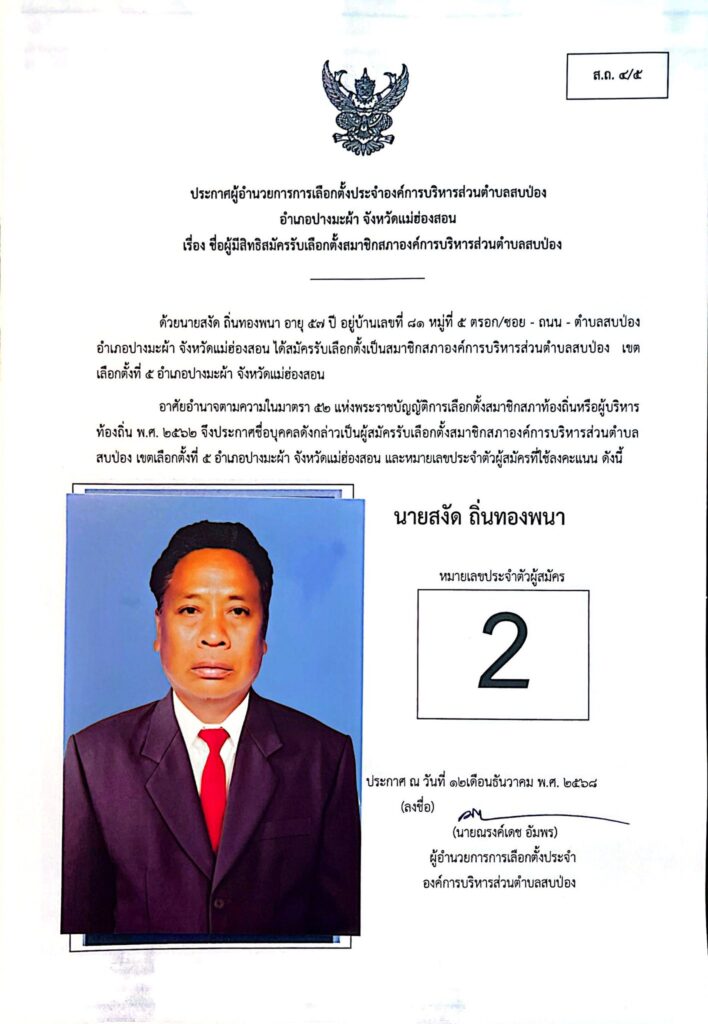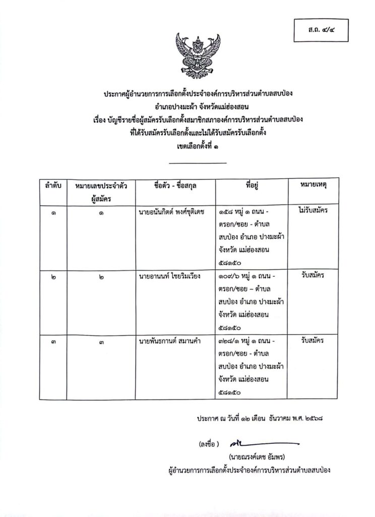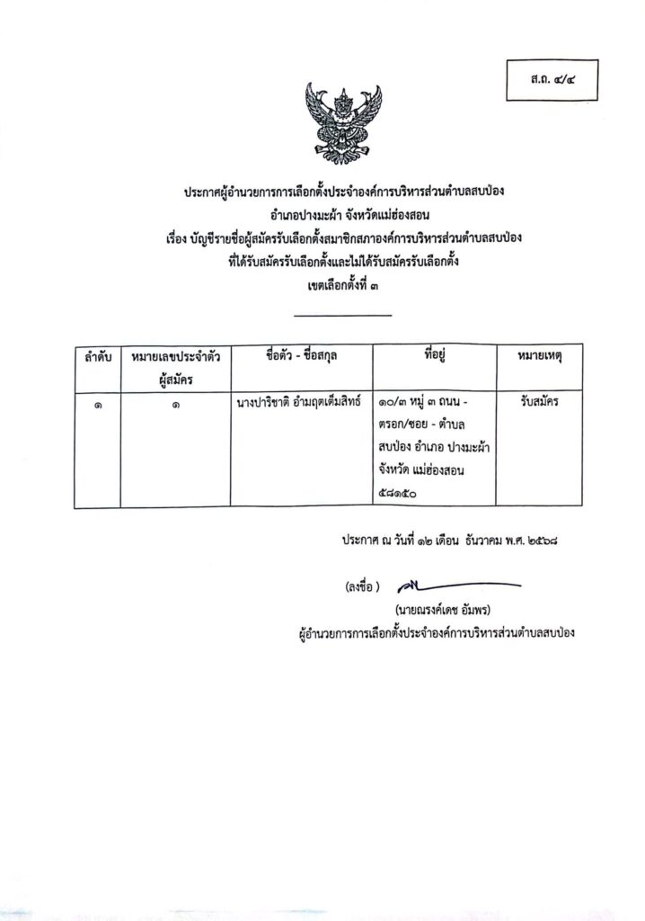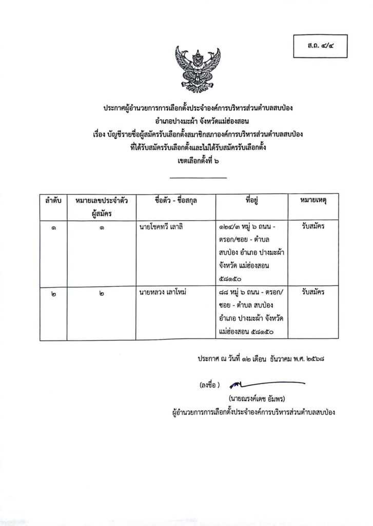 ประกาศผู้อำนวยการการเลือกตั้งประจำองค์การบริหารส่วนตำบลสบป่อง อำเภอปางมะผ้า จังหวัดแม่ฮ่องสอน ข่าวประชาสัมพันธ์, อบต.สบป่อง จำนวนผู้อ่าน : 313