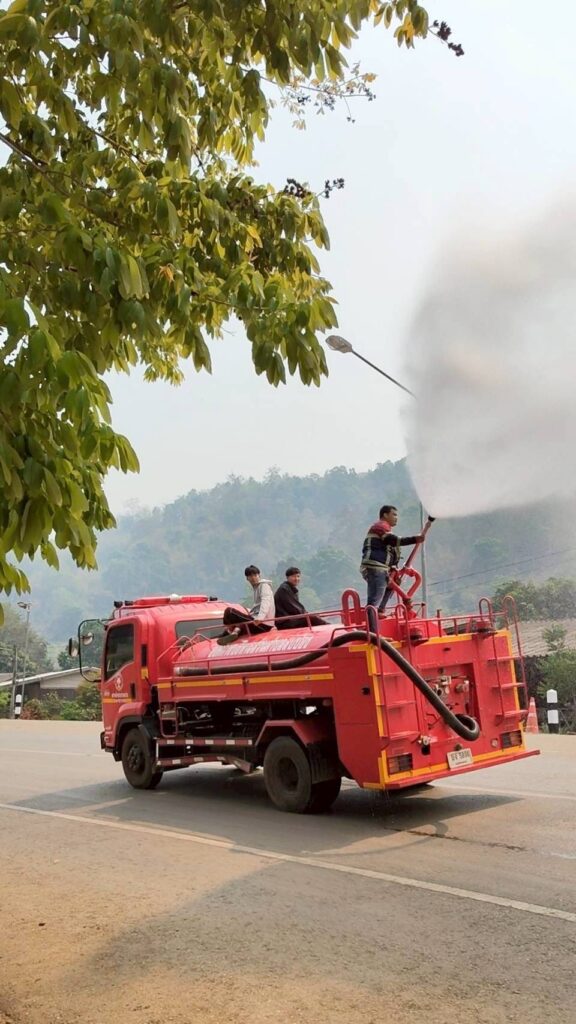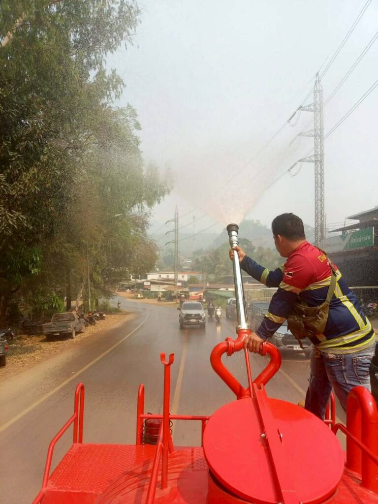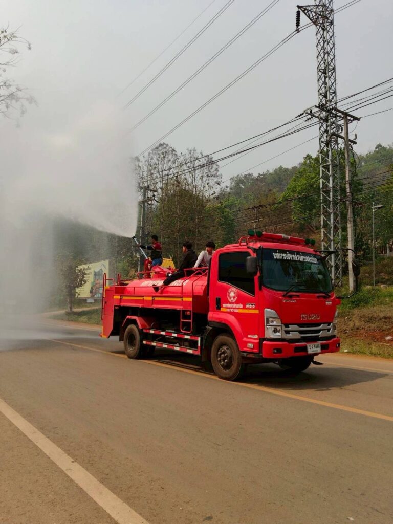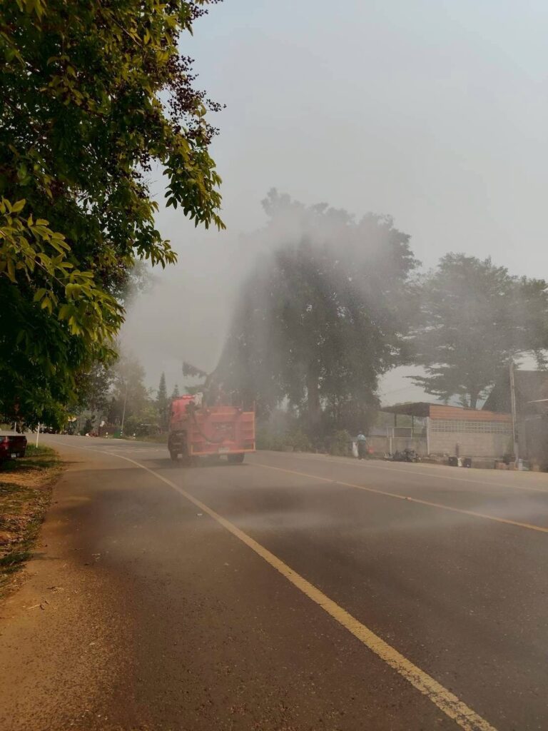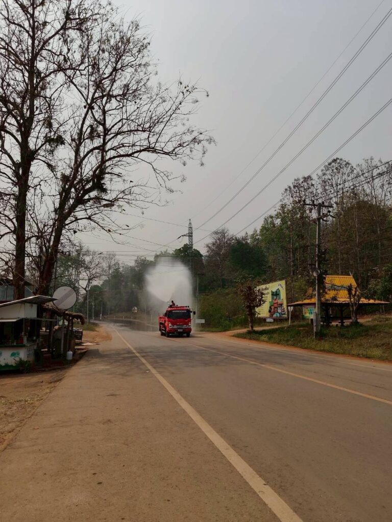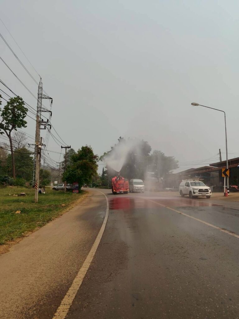 นายโอฬาร ปาริฉัตรพงศ์ นายกองค์การบริหารส่วนตำบลสบป่อง มอบหมายงานป้องกันและบรรเทาสาธารณภัย นำรถน้ำฉีดพ่นละอองน้ำในอากาศ