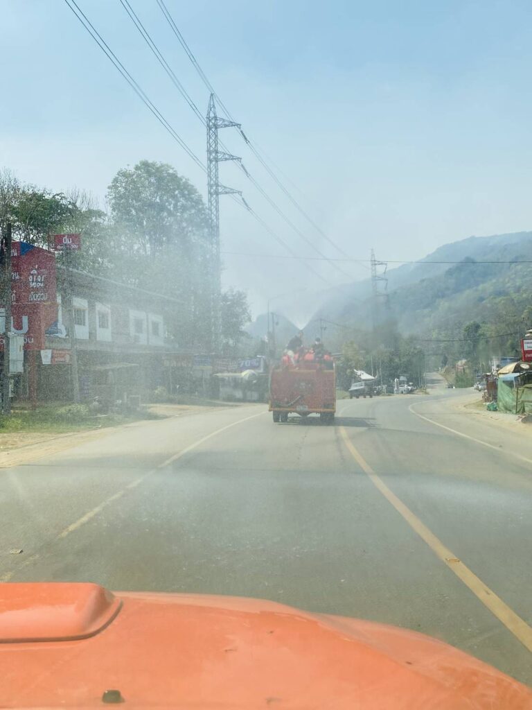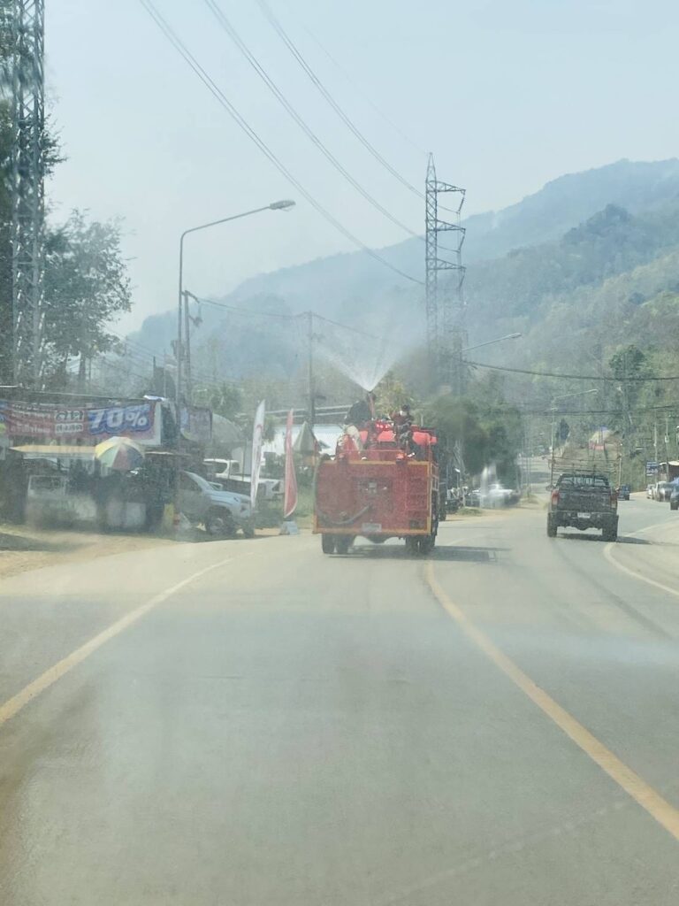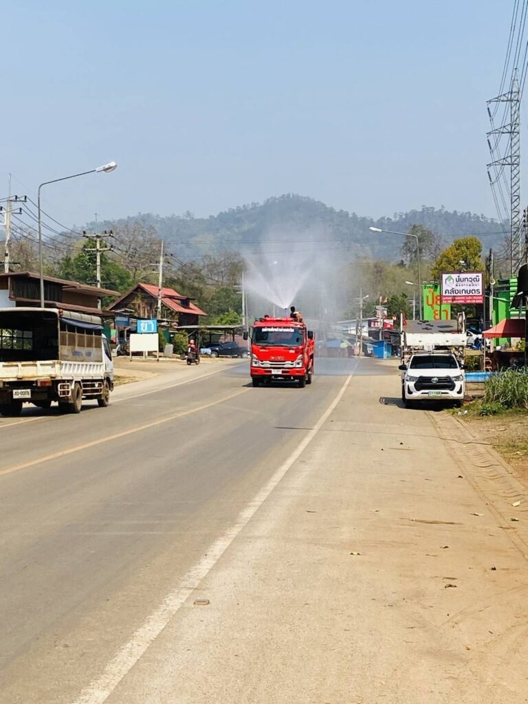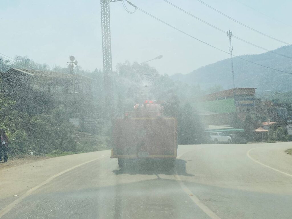 นายโอฬาร ปาริฉัตรพงศ์ นายกองค์การบริหารส่วนตำบลสบป่อง มอบหมายงานป้องกันและบรรเทาสาธารณภัย นำรถน้ำฉีดพ่นละอองน้ำในอากาศ ถนนหลวงเส้น 1095 จาก สามแยกโรงเรียนอนุบาลปางมะผ้าถึงหน้าโรงพยาบาลปางมะผ้า หมู่ที่ 1 ตำบลสบป่อง อำเภอปางมะผ้า จังหวัดแม่ฮ่องสอน ปริมาณน้ำจำนวน 4000 ลิตร
