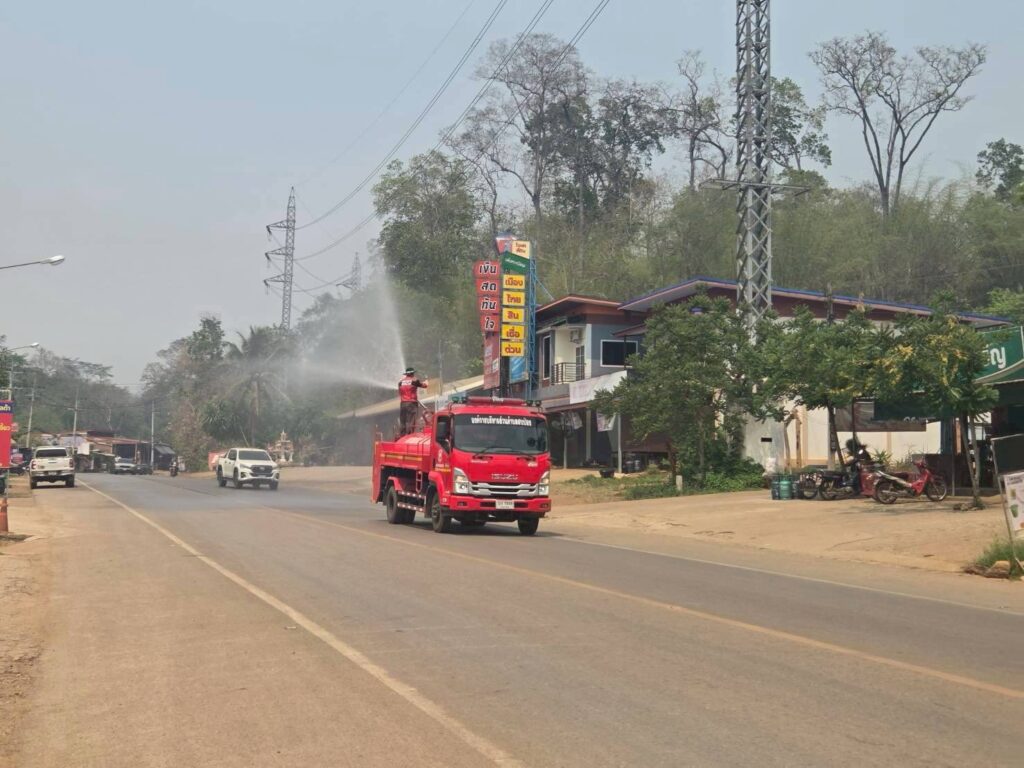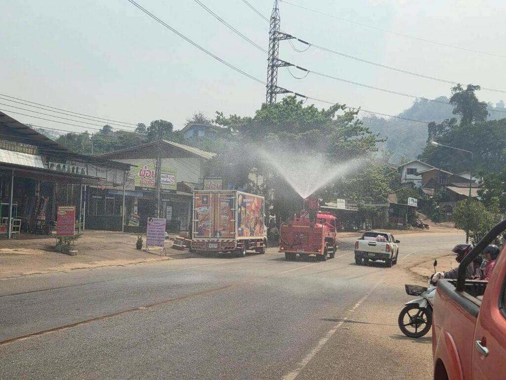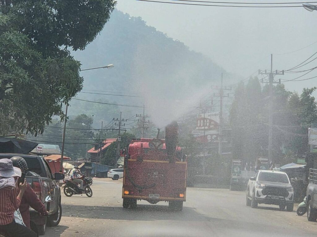 นายโอฬาร ปาริฉัตรพงศ์ นายกองค์การบริหารส่วนตำบลสบป่อง มอบหมายงานป้องกันและบรรเทาสาธารณภัย นำรถน้ำฉีดพ่นละอองน้ำในอากาศ