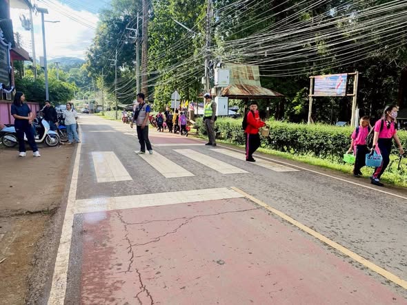 อำนวยความสะดวกการจราจร บริเวณหน้าโรงเรียนอนุบาลปางมะผ้าและบริเวณหน้าศูนย์พัฒนาเด็กเล็กบ้านสบป่อง