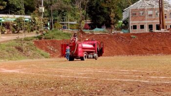 นำน้ำอุปโภค พ่นละอองน้ำที่สนามกีฬาหน้าที่ว่าการอำเภอปางมะผ้า